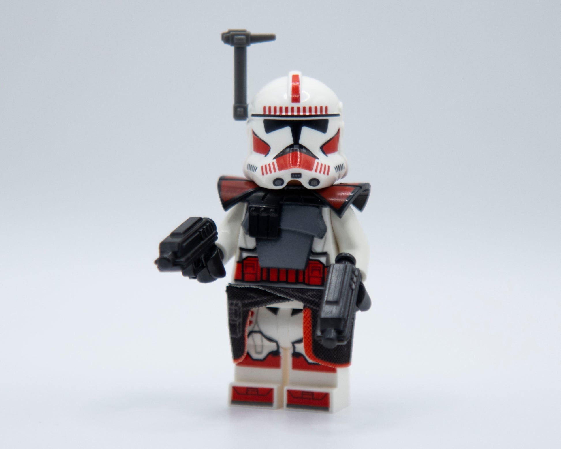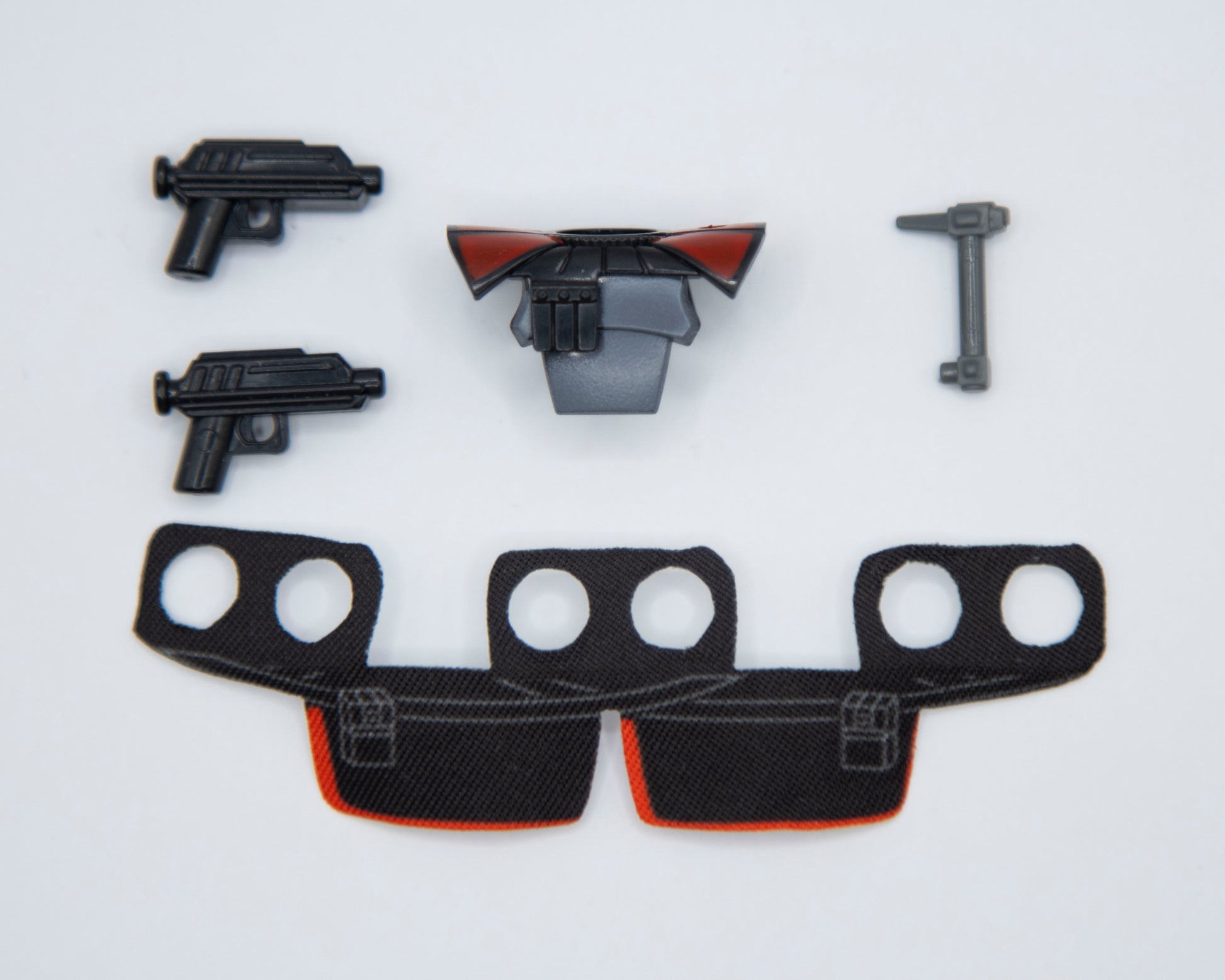 Red ARC Trooper upgrade kit including fabric waistcape, plastic pauldron, antenna, and two custom molded DC-17 hand blasters. Perfect for Coruscant Guard shock troopers.